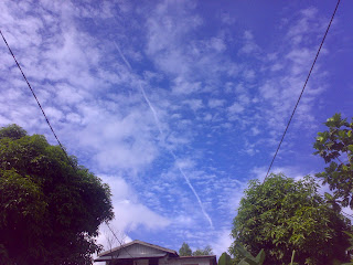 Kaget juga pas lihat ke langit, kok awanx bentuknya begitu,,,,,aneh juga, memanjang,bekas asap pesawat kali ya.
